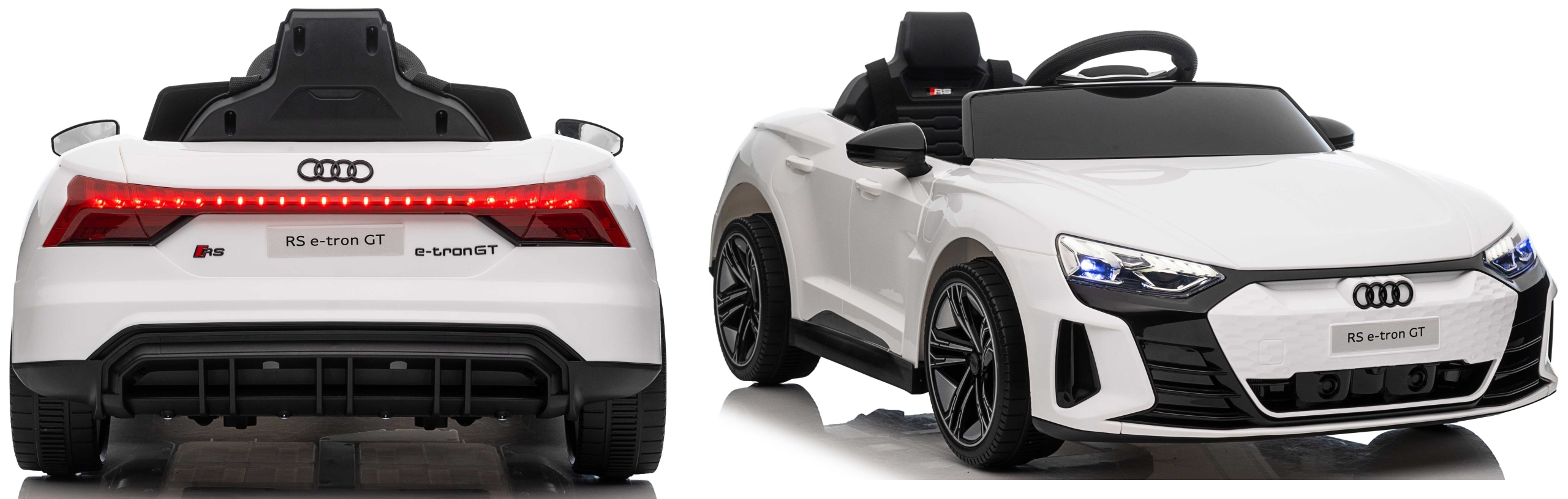 Samochód audi e-tron rs gt to pojazd na akumulator na licencji audi. Pojazd posiada otwierane drzwi z obu stron. Napęd zapewniają mu cztery potężne silniki elektryczne, zasilane akumulatorem 12v7ah. Na wyposażeniu pojazdu znajdują się uruchamiane przyciskami efekty dźwiękowe, wejście na odtwarzacz mp3, port usb,port tf, regulator głośności, światła led, miękkie siedzisko z eko-skóry, koła piankowe eva. Dostępne są 3 prędkości poruszania. Bezpieczną naukę jazdy zapewnia dołączony pilot zdalnego sterowania 2.4g, dający rodzicowi pełną kontrolę nad pojazdem.