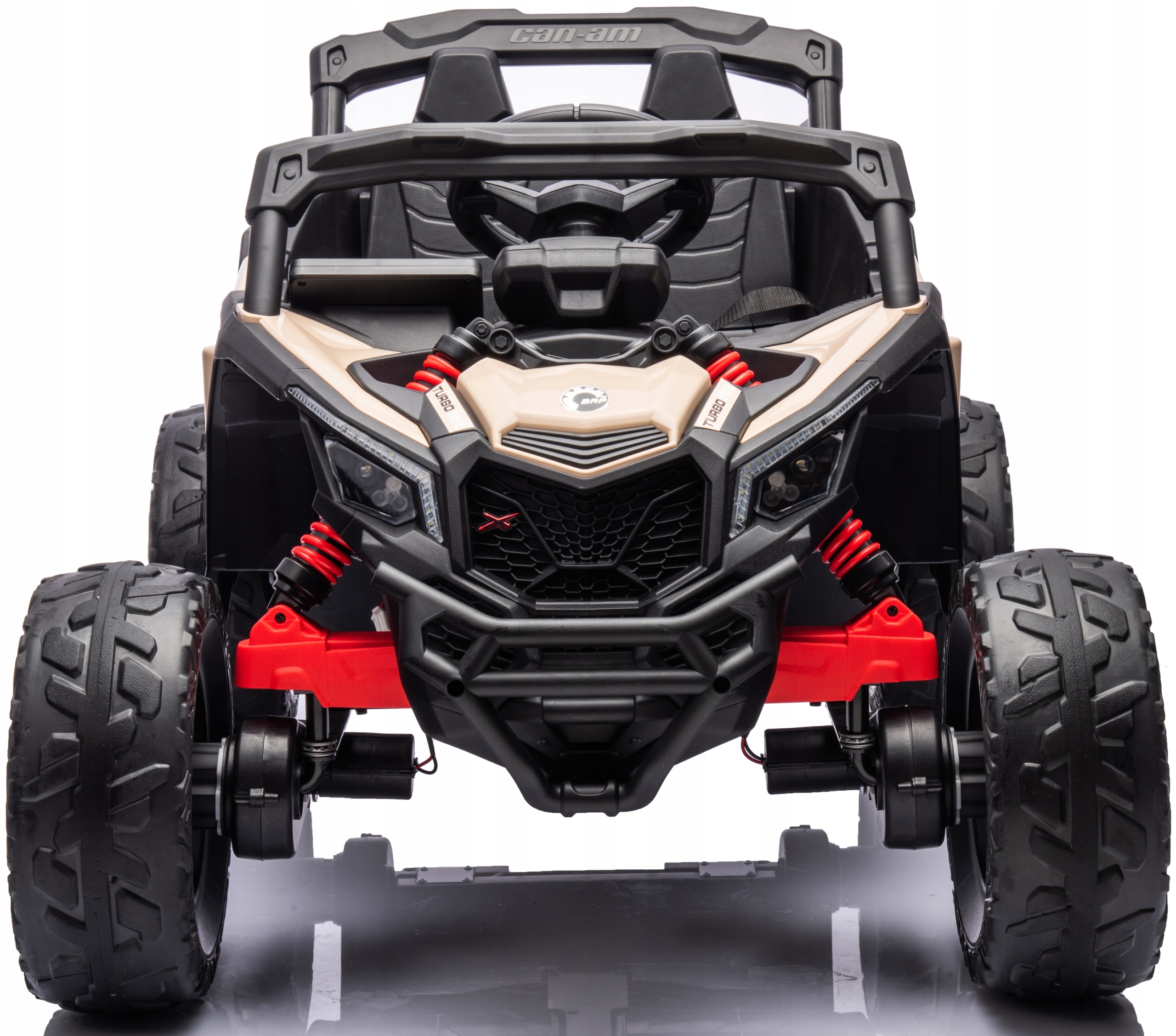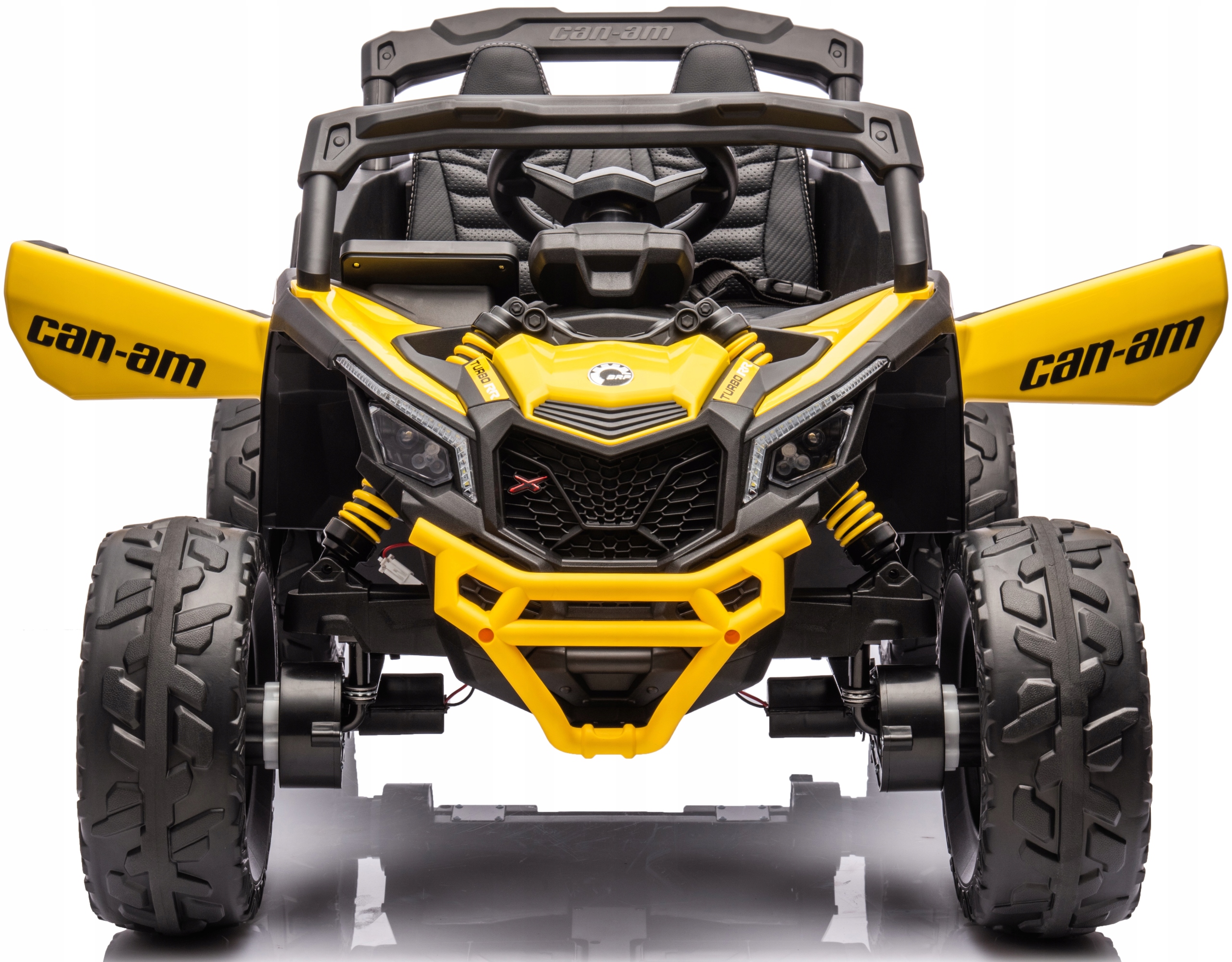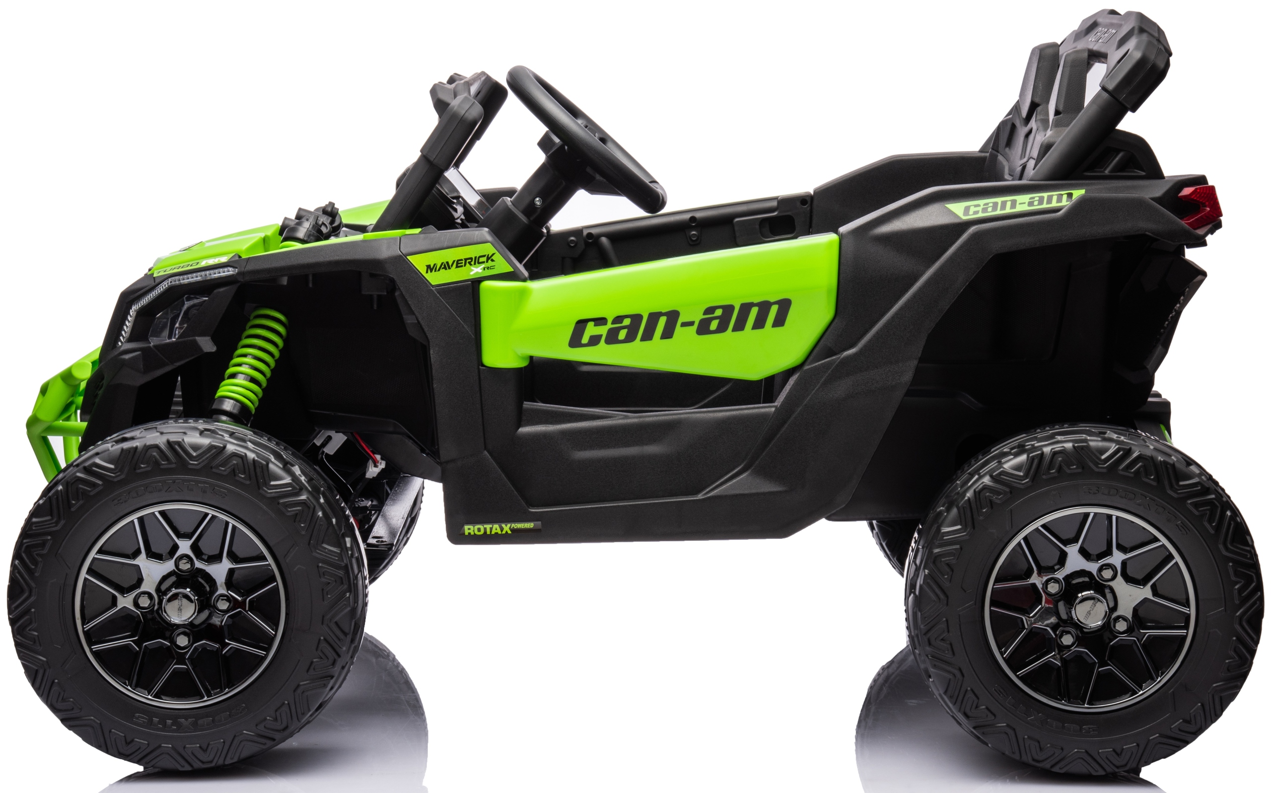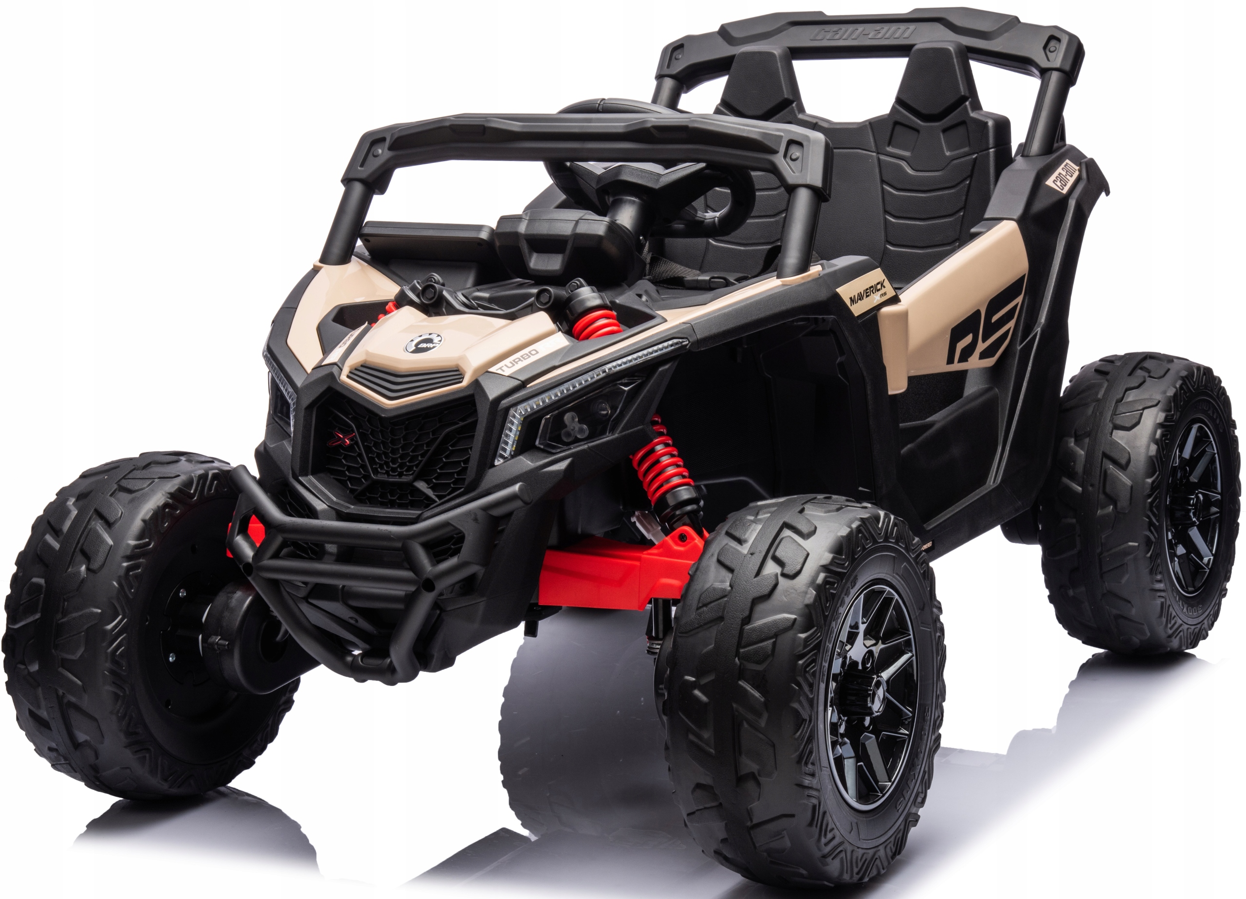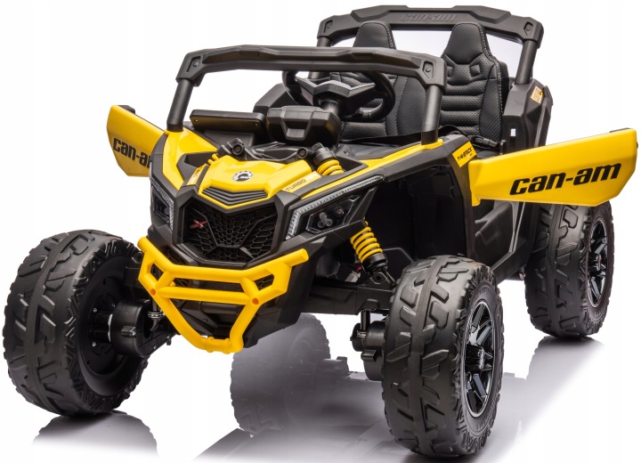 Oryginalny pojazd buggy utv can-am maverick na akumulator, na licencji can-am. Pojazd posiada otwierane drzwi z obu stron. Napęd zapewniają mu cztery potężne silniki elektryczne, każdy po 200w (łącznie 800wat), zasilane akumulatorem 24v. Na wyposażeniu pojazdu znajdują się uruchamiane przyciskami efekty dźwiękowe, wejście na odtwarzacz mp3, regulator głośności, światła led. Dostępne są 3 prędkości poruszania (z funkcji pilota). Bezpieczną naukę jazdy zapewnia dołączony pilot zdalnego sterowania, dający rodzicowi pełną kontrolę nad pojazdem. Miękkie piankowe koła eva + miękkie siedzisko z eko-skóry.