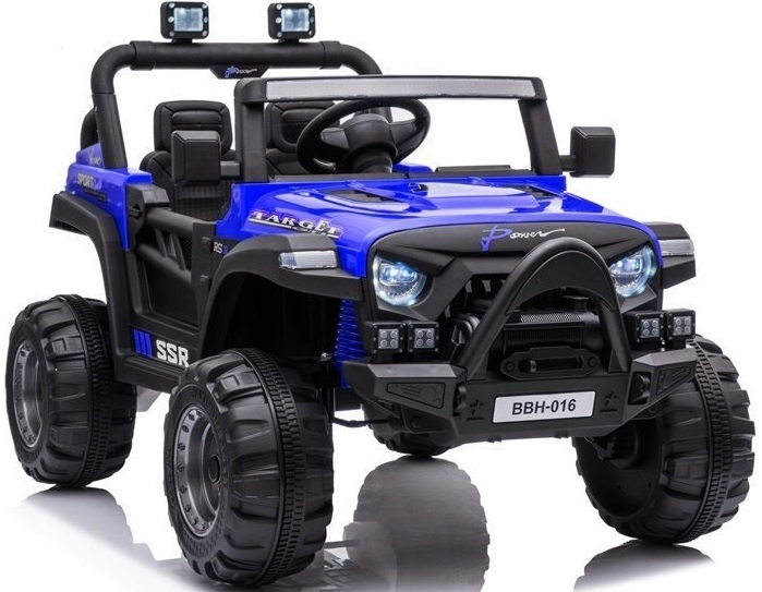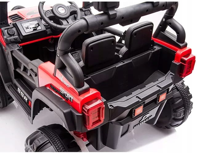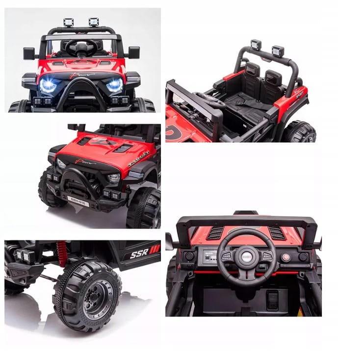 Samochód jeep na akumulator. Pojazd posiada otwierane drzwi z obu stron. Napęd zapewniają mu cztery potężne silniki elektryczne, każdy po 45w. Zasilany akumulatorem o pojemności 12v7ah. Na wyposażeniu pojazdu znajdują się uruchamiane przyciskami efekty dźwiękowe, wejście na odtwarzacz mp3, regulator głośności, światła led. Dostępne są 3 prędkości poruszania (z funkcji pilota). Bezpieczną naukę jazdy zapewnia dołączony pilot zdalnego sterowania, dający rodzicowi pełną kontrolę nad pojazdem