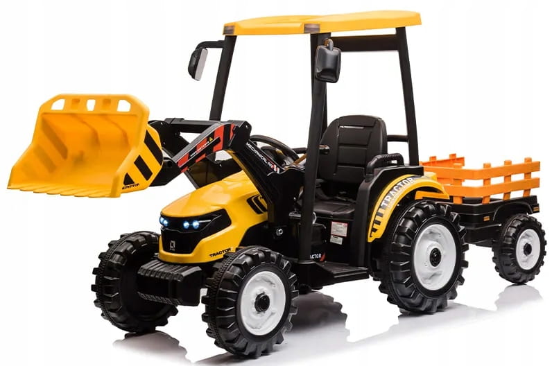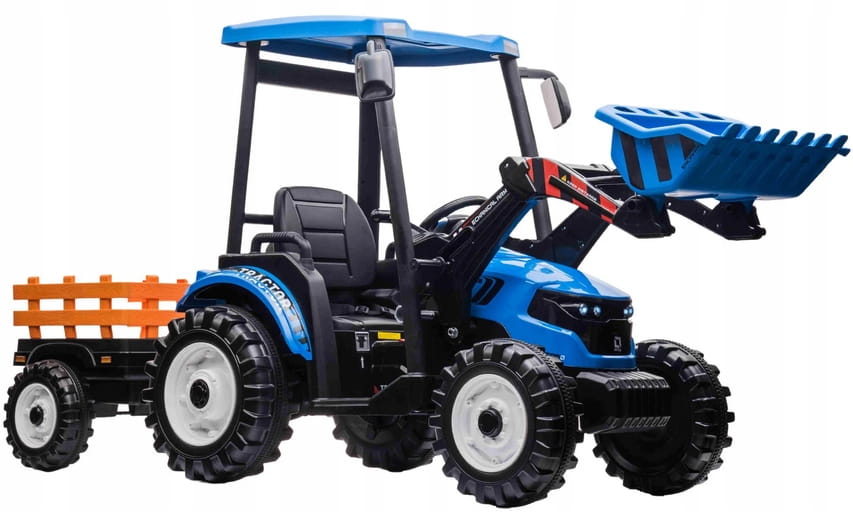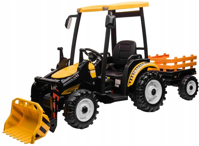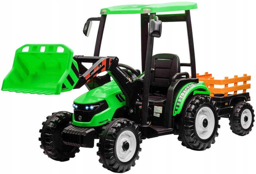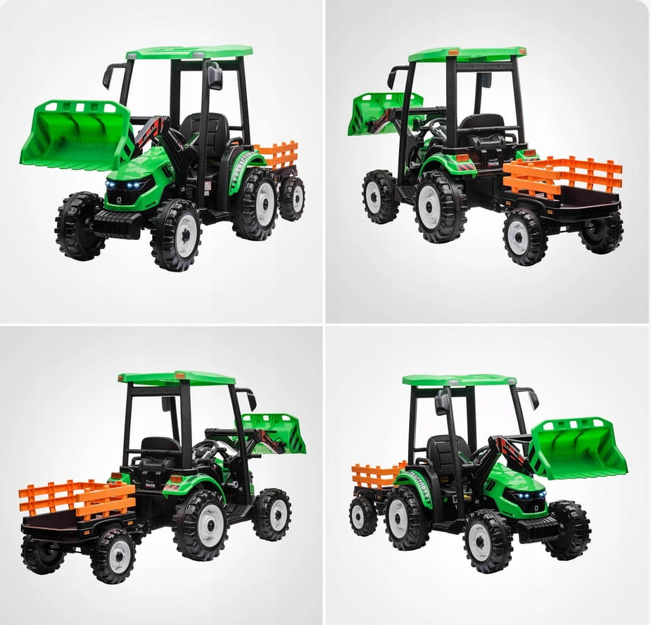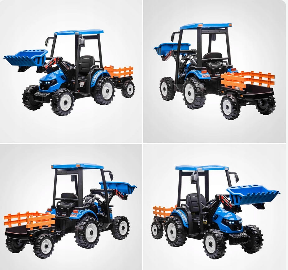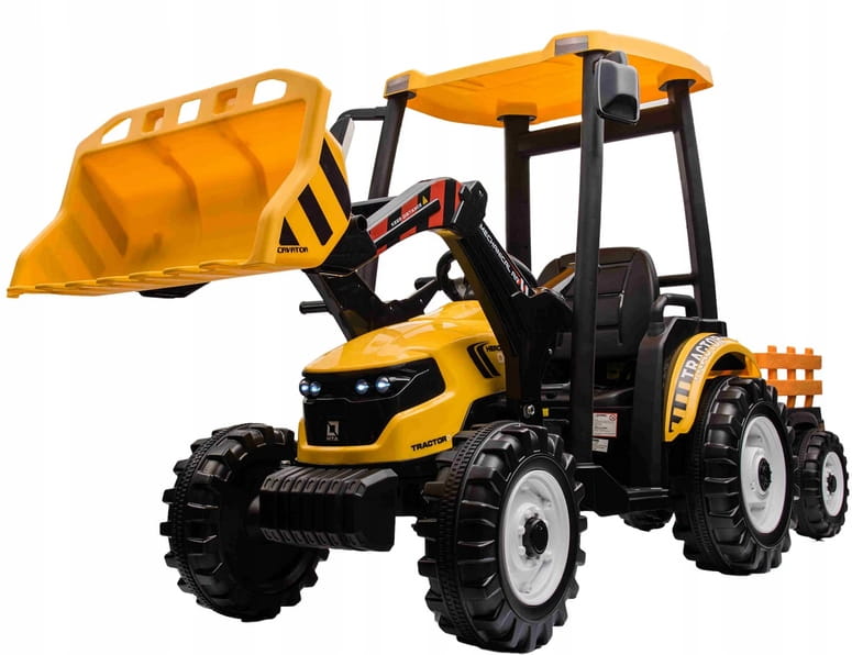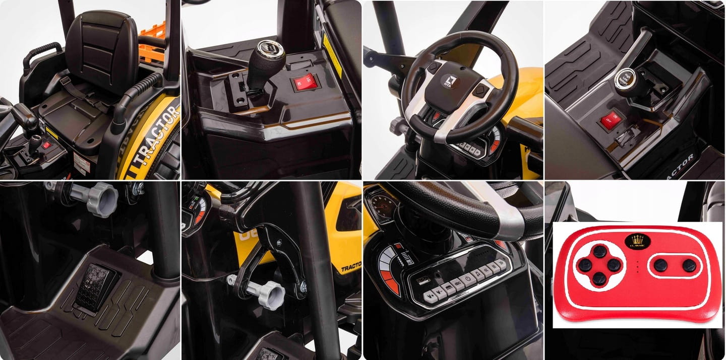 Napęd zapewniają mu dwa potężne silniki elektryczne 24v każdy po 200w, zasilane akumulatorem 24v7ah. Na wyposażeniu pojazdu znajdują się uruchamiane przyciskami efekty dźwiękowe, port usb - możliwość słuchania muzyki z pendrive, regulator głośności, światła led. Dostępne są 3 prędkości poruszania z pilota. Bezpieczną naukę jazdy zapewnia dołączony pilot zdalnego sterowania 2.4g, dający rodzicowi pełną kontrolę nad pojazdem. Przyczepkę można odpinać, dach ewentualnie można zdemontować, ruchoma łyżka z możliwością demontażu.