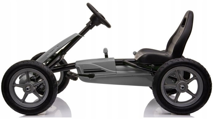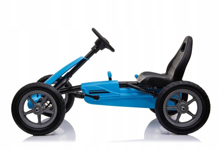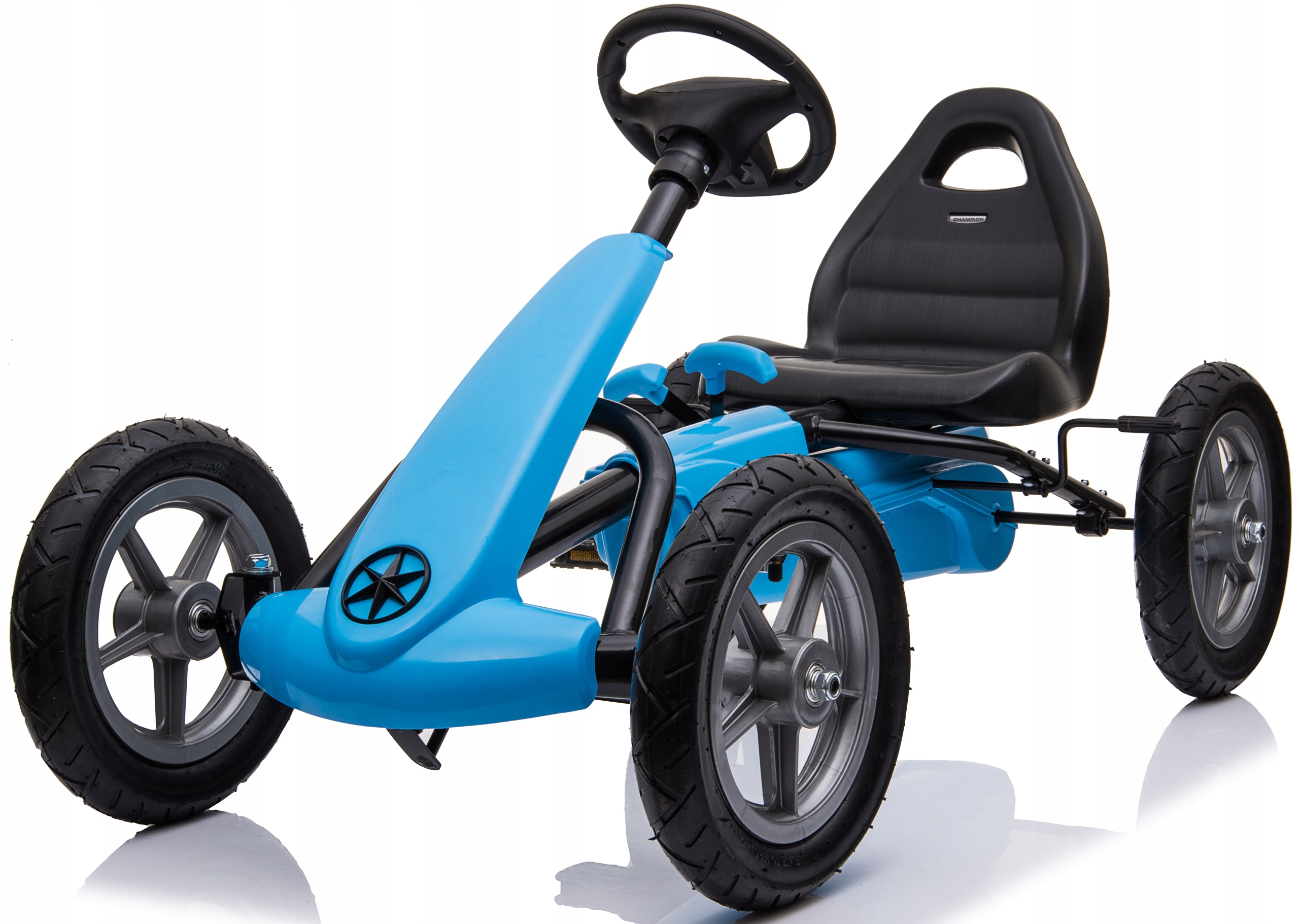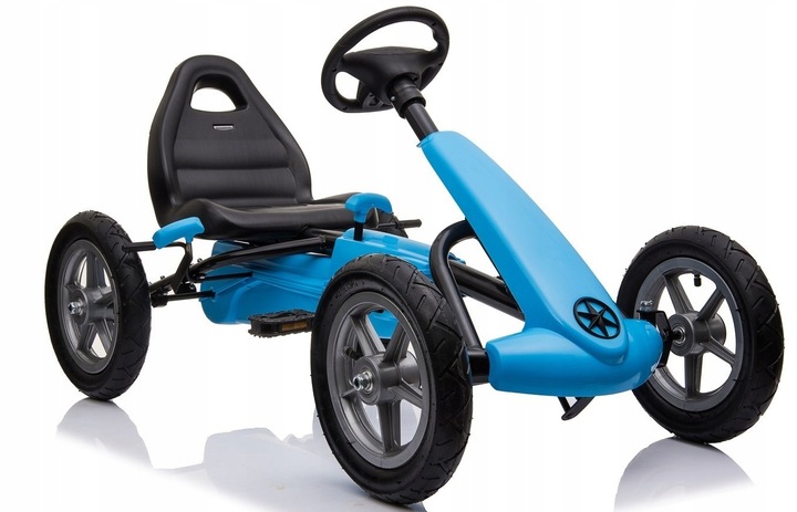 Gokart na pedały z pompowanymi kołami i hamulcem ręcznym. Przeznaczony dla dzieci od 4-10 lat, do wagi 50kg.