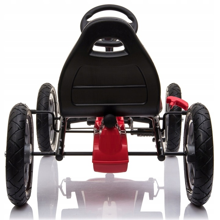 Gokart na pedały z pompowanymi kołami i hamulcem ręcznym. Przeznaczony dla dzieci od 4-10 lat, do wagi 50kg.